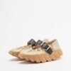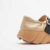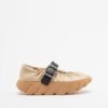 Beige leather shoes with a wrinkled effect and platform sole. Black strap at the top with a detachable buckle