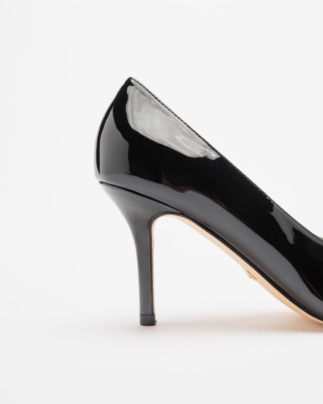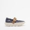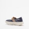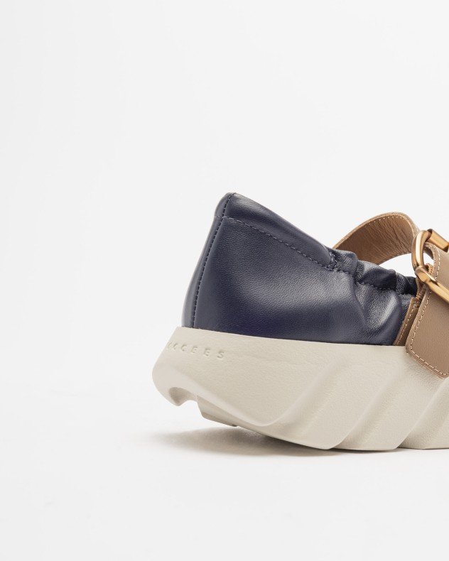 Blue shoes in wrinkled leather with a platform sole. Camel strap at the top with a detachable buckle.