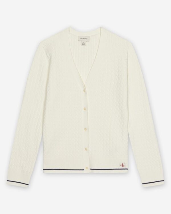 Beige cable-knit jumper with a V-neck and button fastening at the front. Calvin Klein logo patch at the waist.