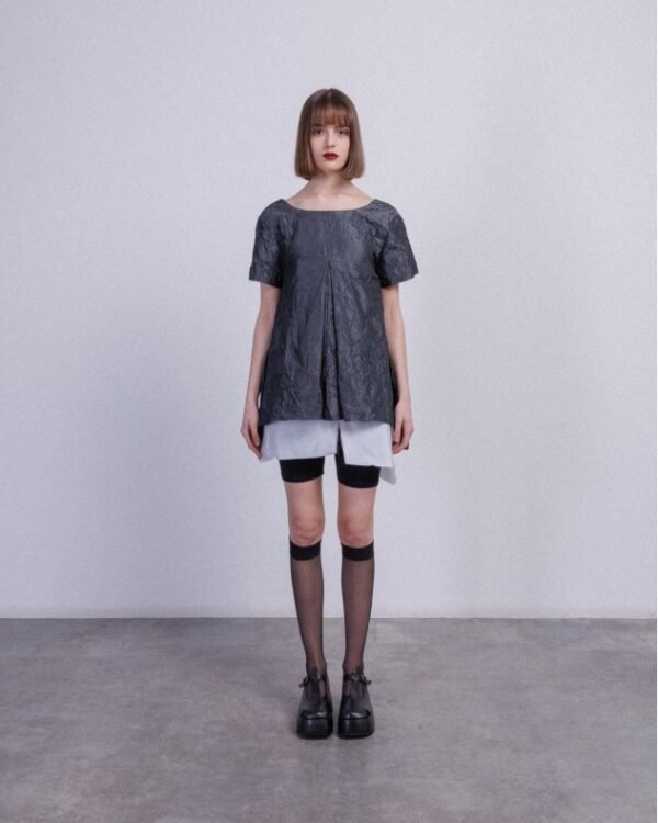 Short-sleeved gray tunic with wrinkled design and asymmetrical white lining.