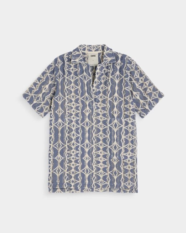 OAS blue dress in printed jacquard knit with side pockets. Open collar with deep cut at the front.