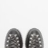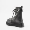 Black leather boots with corrugated platform sole and zipper of running back. Nylon cords and silver eyelets.