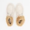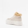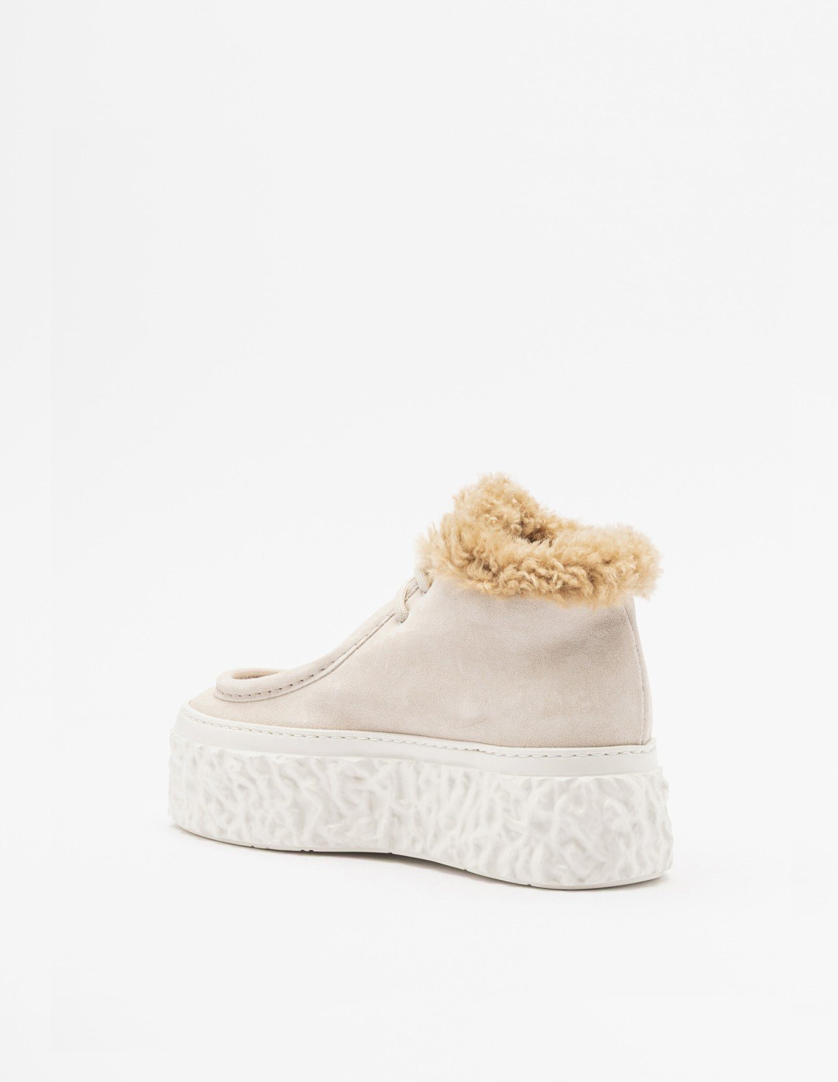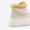 Beige suede ankle boots with fur trim on the shaft and a rugged platform sole.