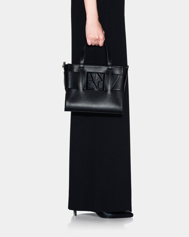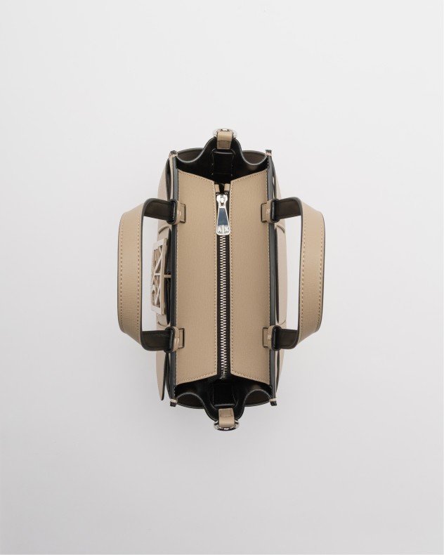 Armani Exchange taupe handbag in faux leather with logo appliqué on the front. Optional shoulder strap.