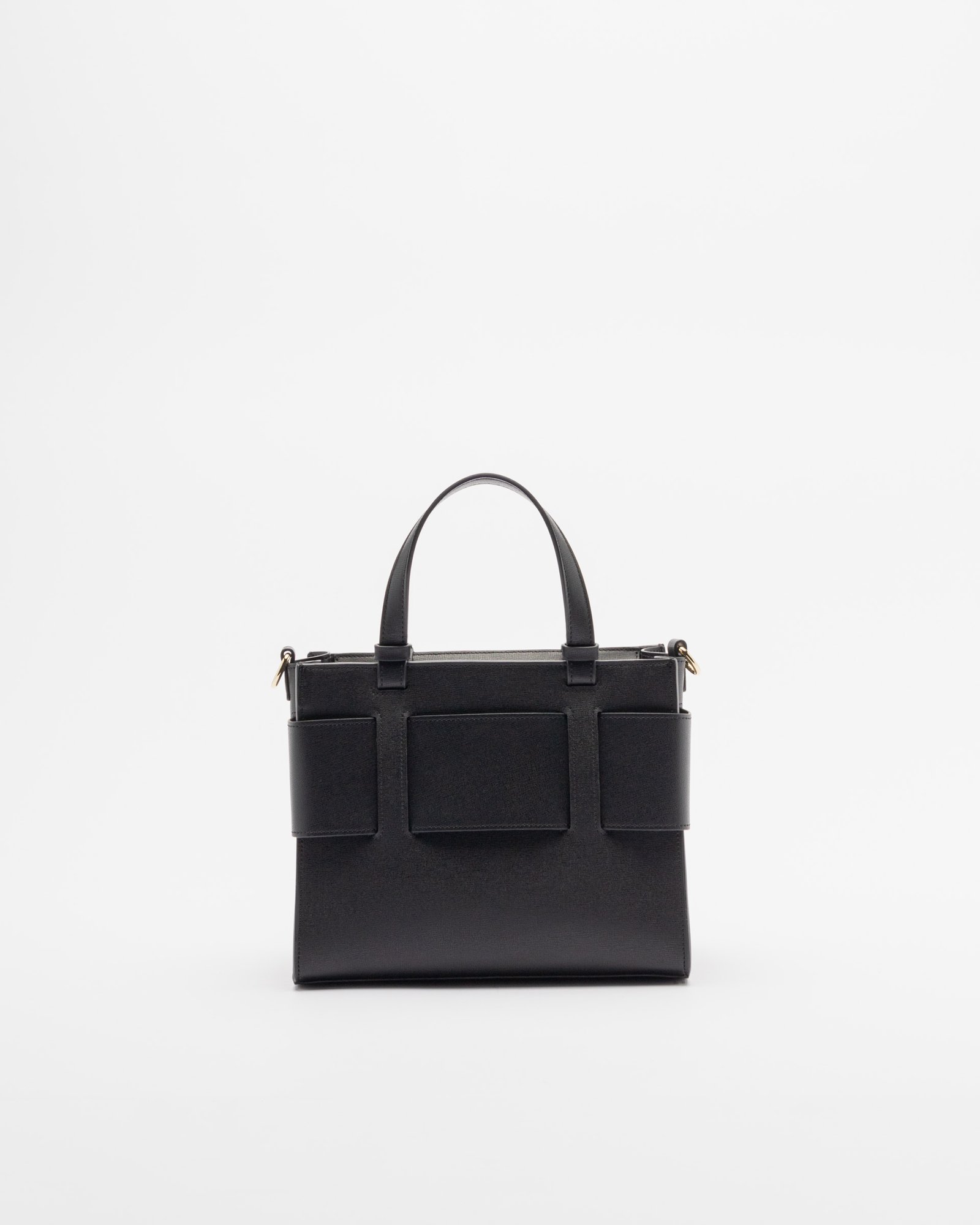 Black faux leather bag with logo appliqué on the front. Optional shoulder strap.