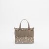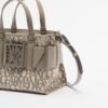 Taupe faux leather tote bag with double handles. Features a belt around the bag and an Armani Exchange metal plaque detail.