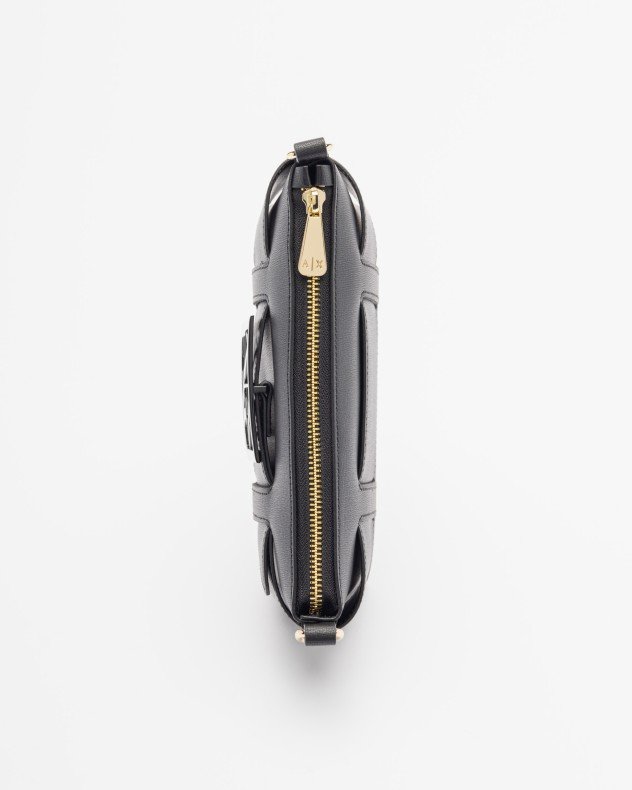 Black faux leather bag with shoulder strap. Armani Exchange logo appliqué on the front.