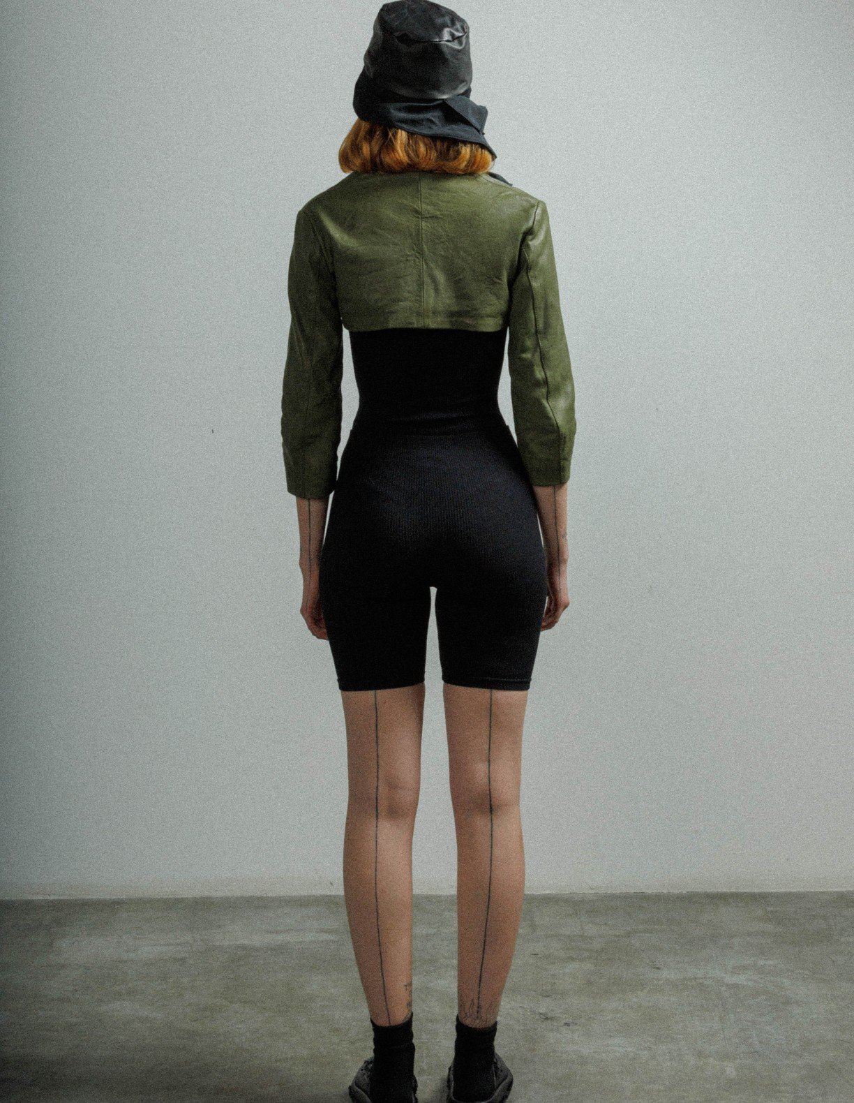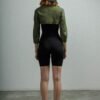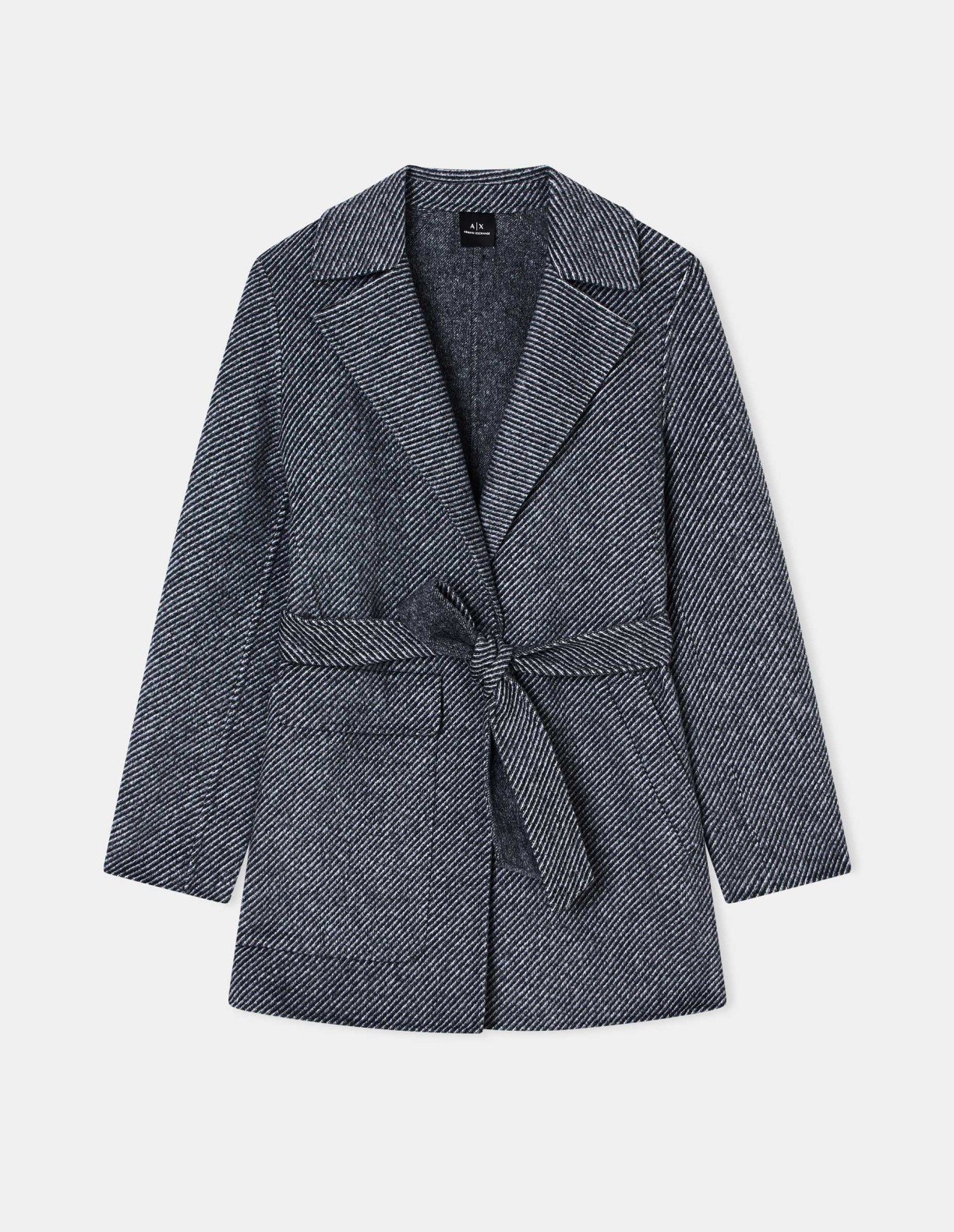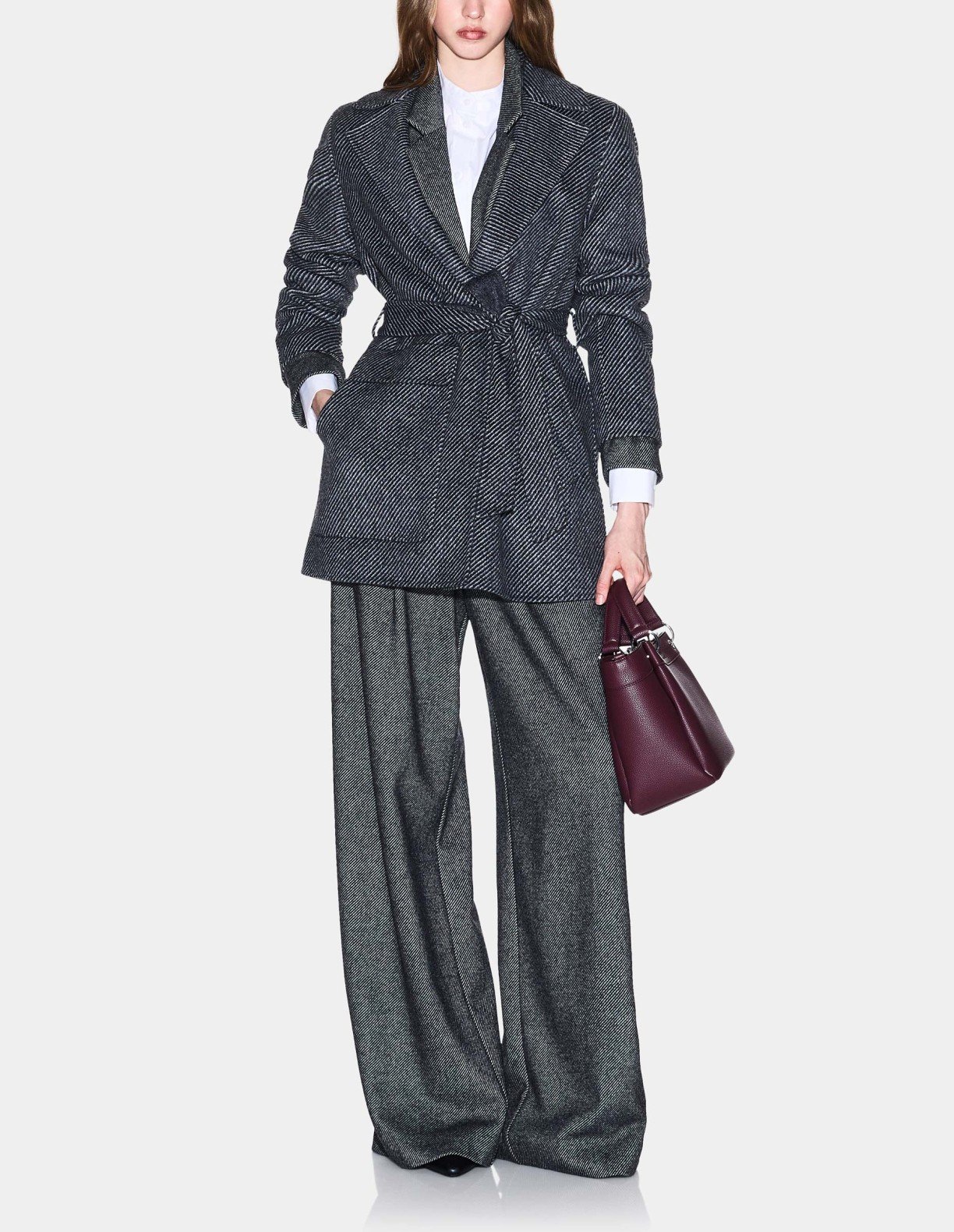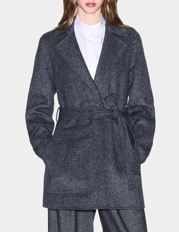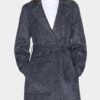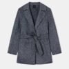 Gray belted jacket made from a blend of textiles. Large lapels and a single-button closure.