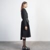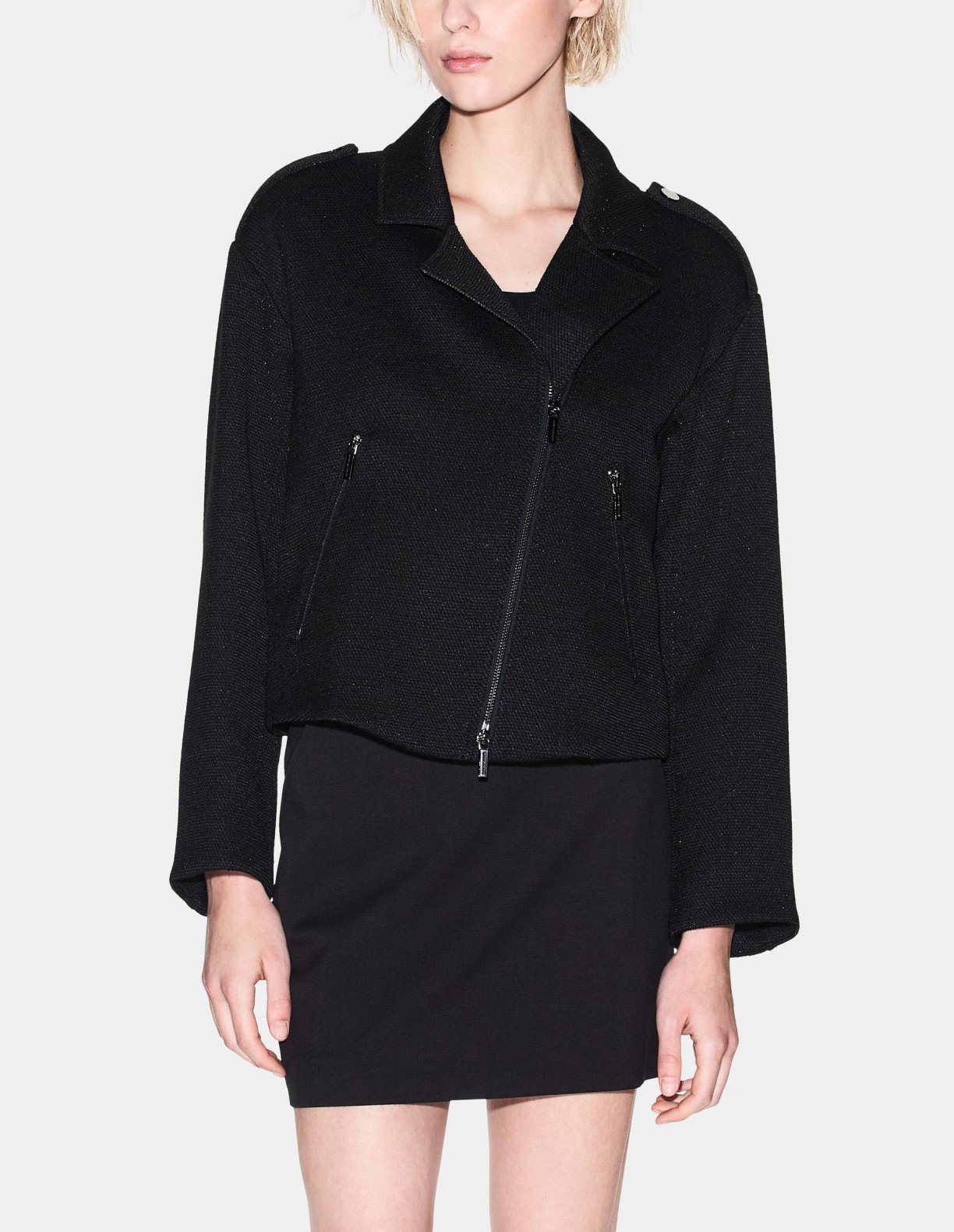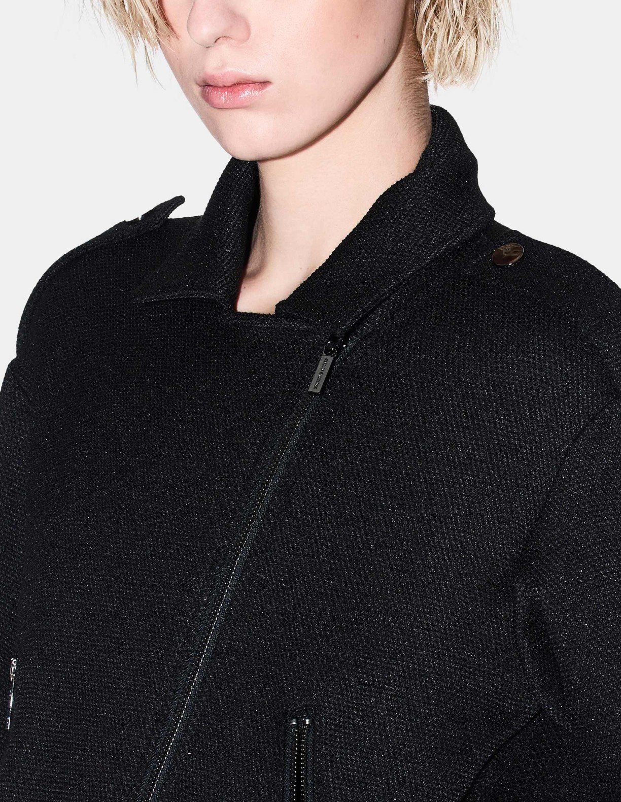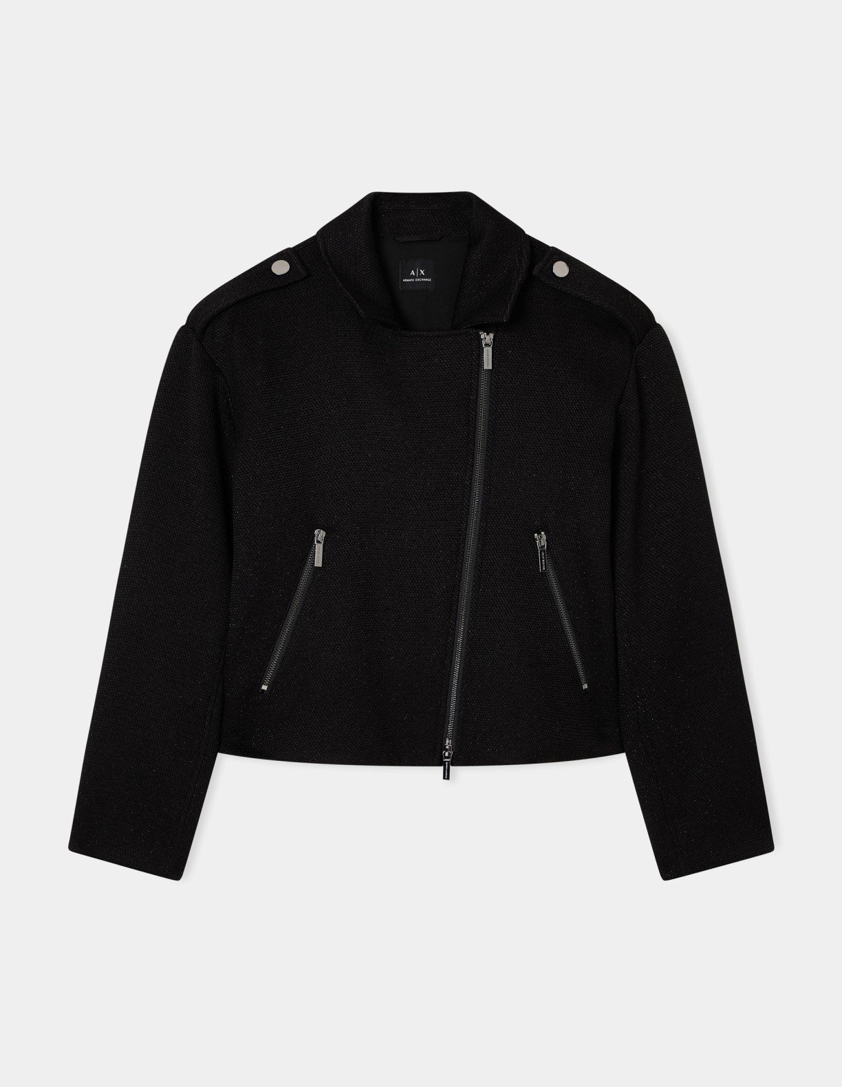 Women’s black coat with a shiny effect. Metal plate on the back with the Armani Exchange logo.
