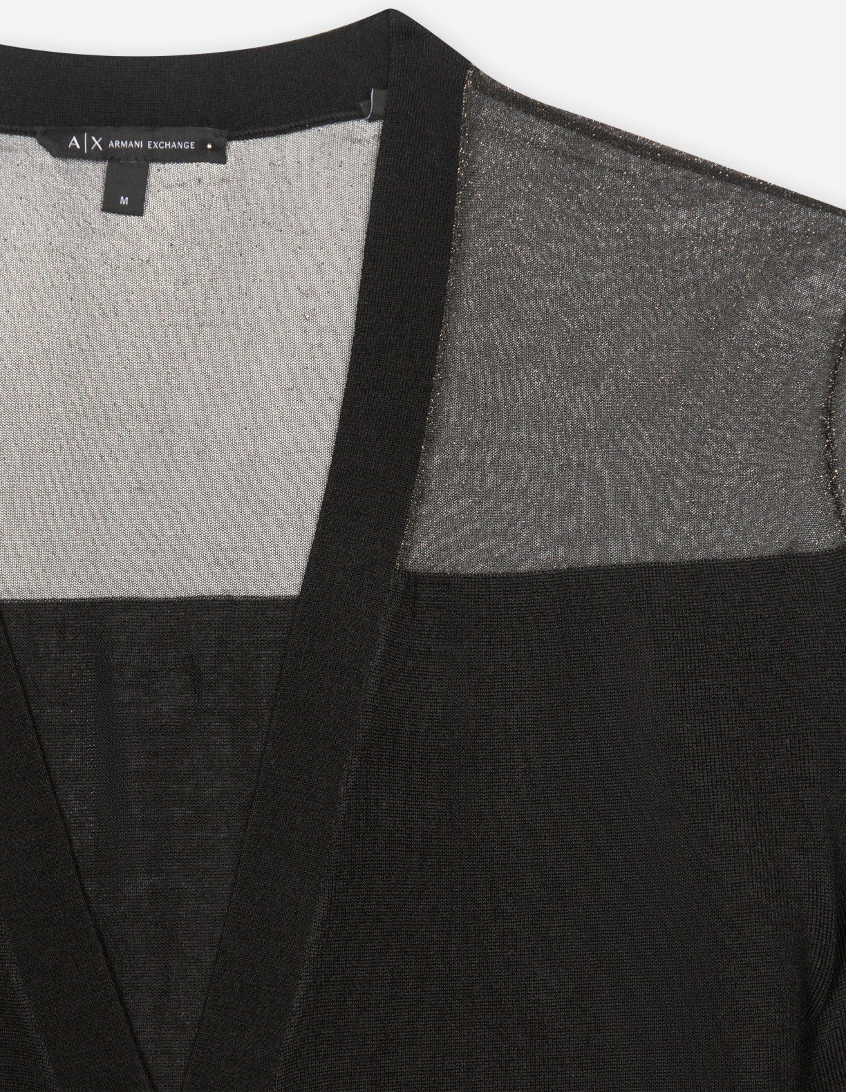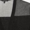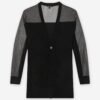 Black knit coat with shiny, sheer detailing on the sleeves. V-neckline and single-button closure.