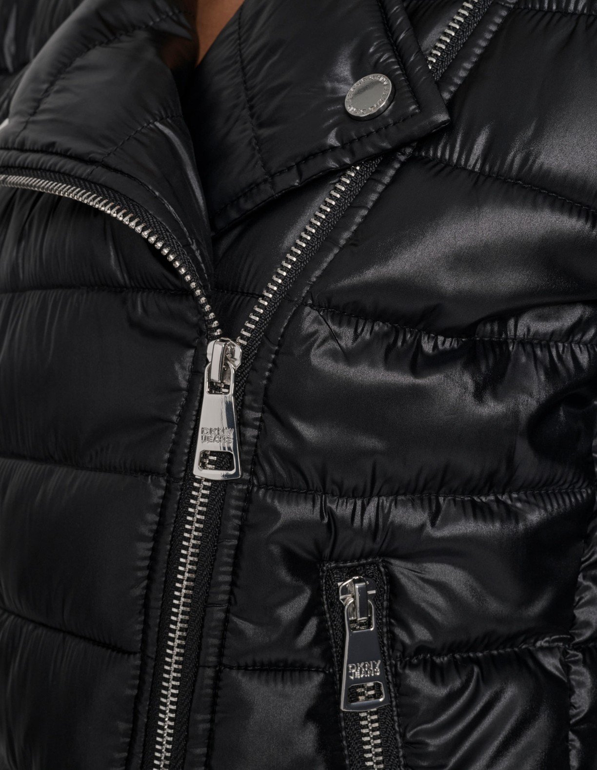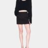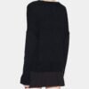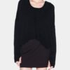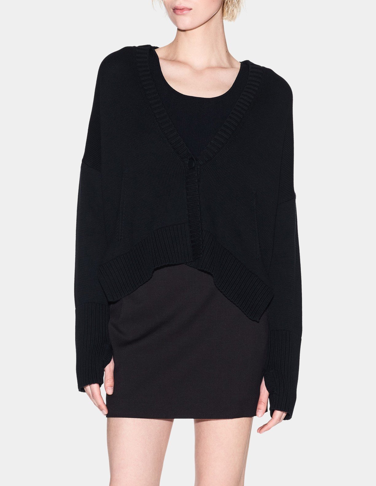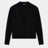 Black knit jacket with an asymmetrical design and ribbed effect. Features a V-neckline and single-button closure.
