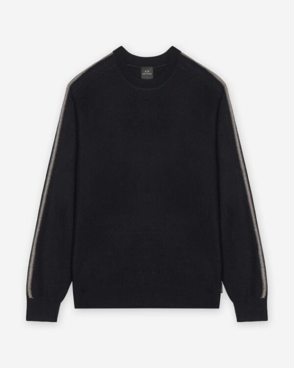 Men’s blue knit sweater with contrasting stripes on the sleeves. Armani Exchange brand label on the side.