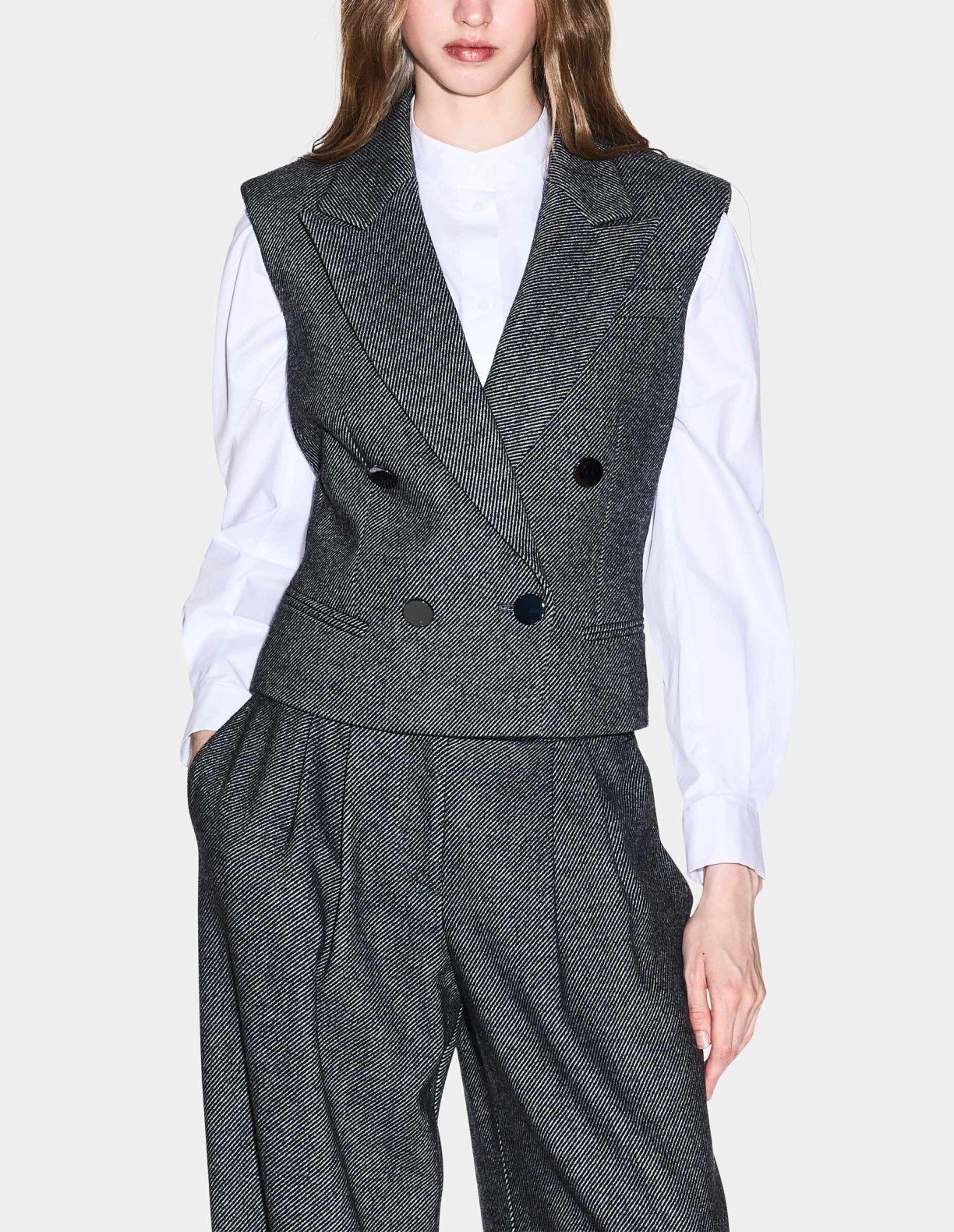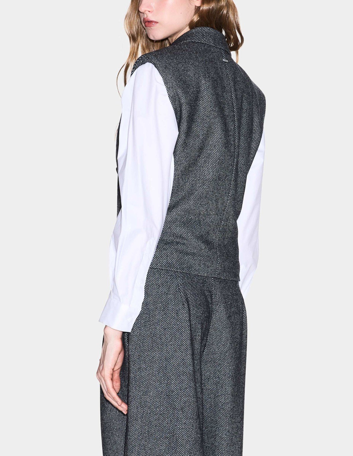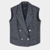 Gray vest with shoulder pads and notch lapels. Button closure on the front and Armani Exchange metal plate on the back.