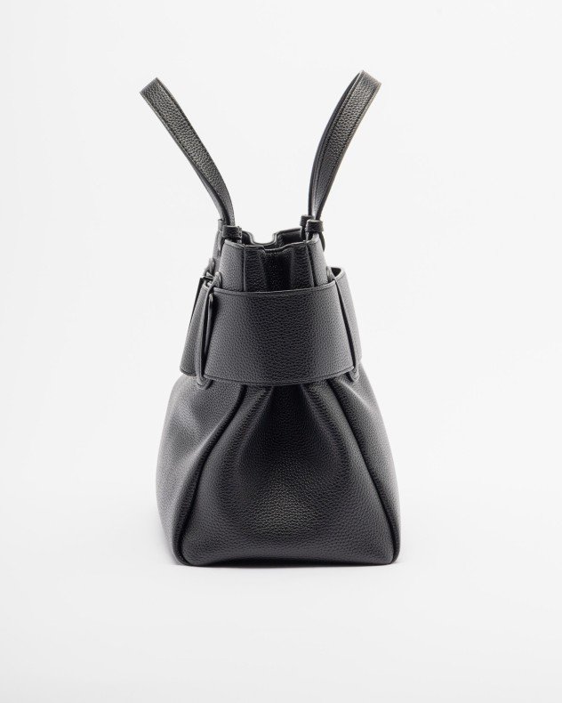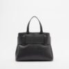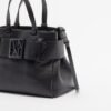 Black Armani Exchange shopper bag in grained faux leather. Decorative belt and metal logo detail.