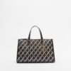Black bag with multicolor print and lettering pattern. Metal pendant with Armani Exchange logo.