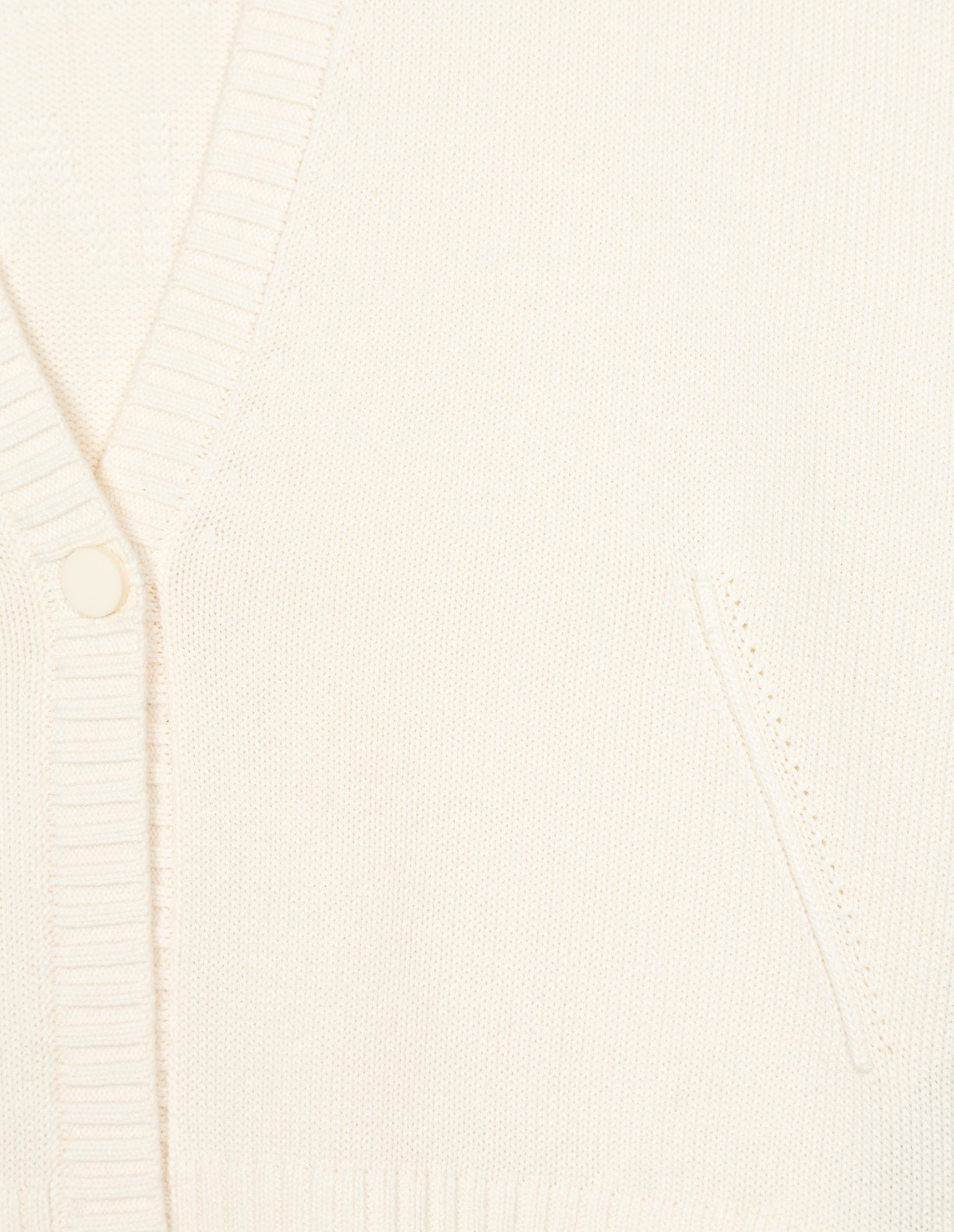 White knit jacket with an asymmetrical design and ribbed effect. Features a V-neckline and single-button closure.