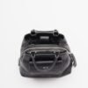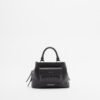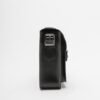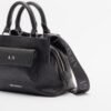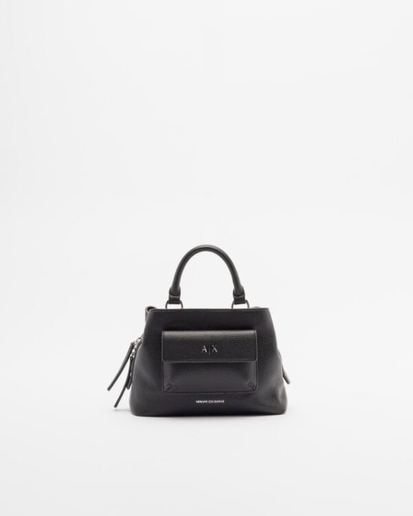 Black faux leather bag with a grained effect. Exterior pocket with silver AX logo and optional wide interior strap.