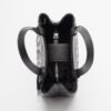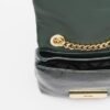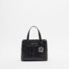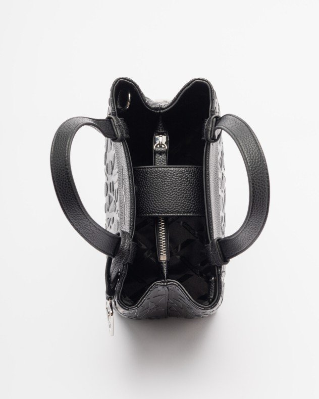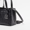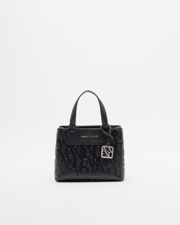Black Armani Exchange bag with lettering pattern. Silver logo on the front.