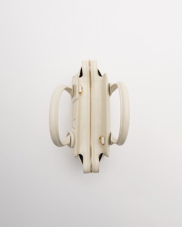 Armani Exchange black small handbag with double handles and gold A|X logo detail on the front.