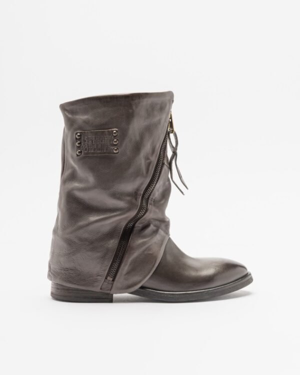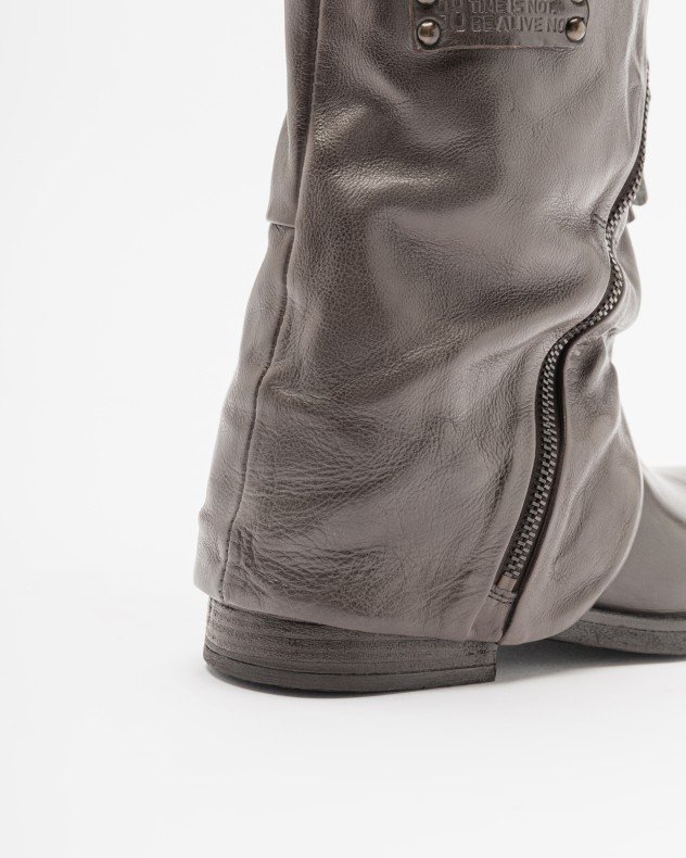 Grey leather boots with decorative diagonal zipper. Exclusive AS 98 stud detail.