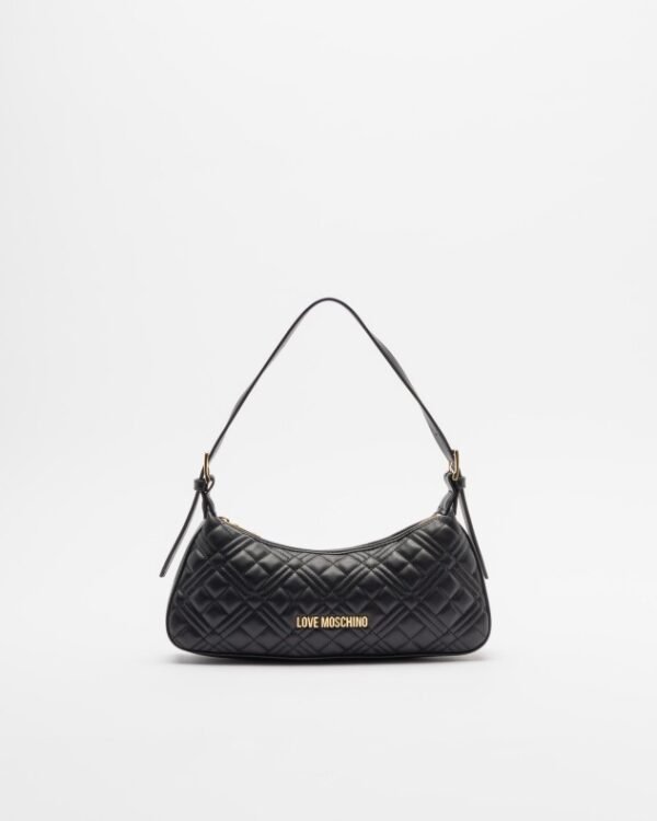 Black Love Moschino baguette-style bag in faux leather with a quilted effect. Features topstitching and gold metallic Love Moschino lettering.