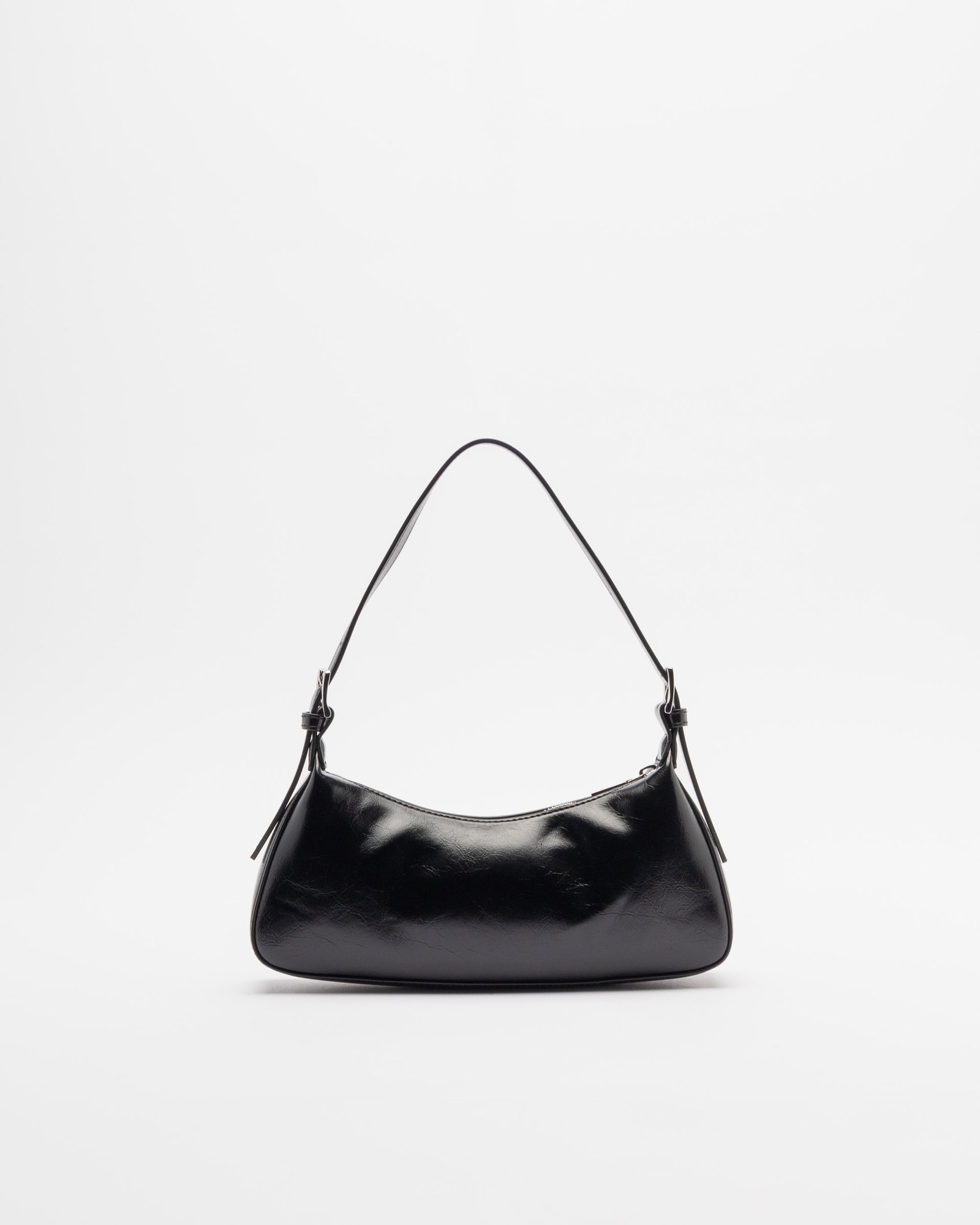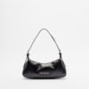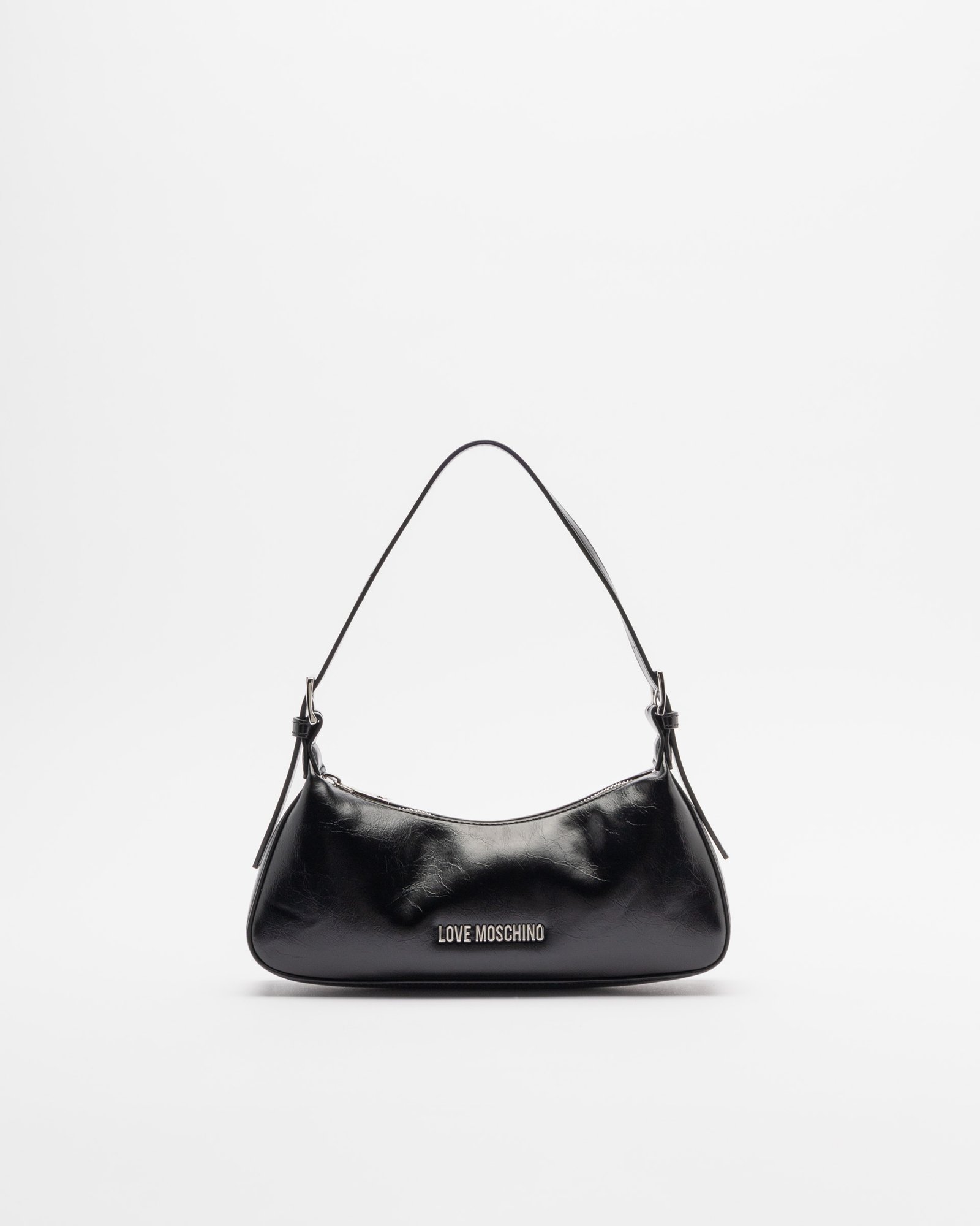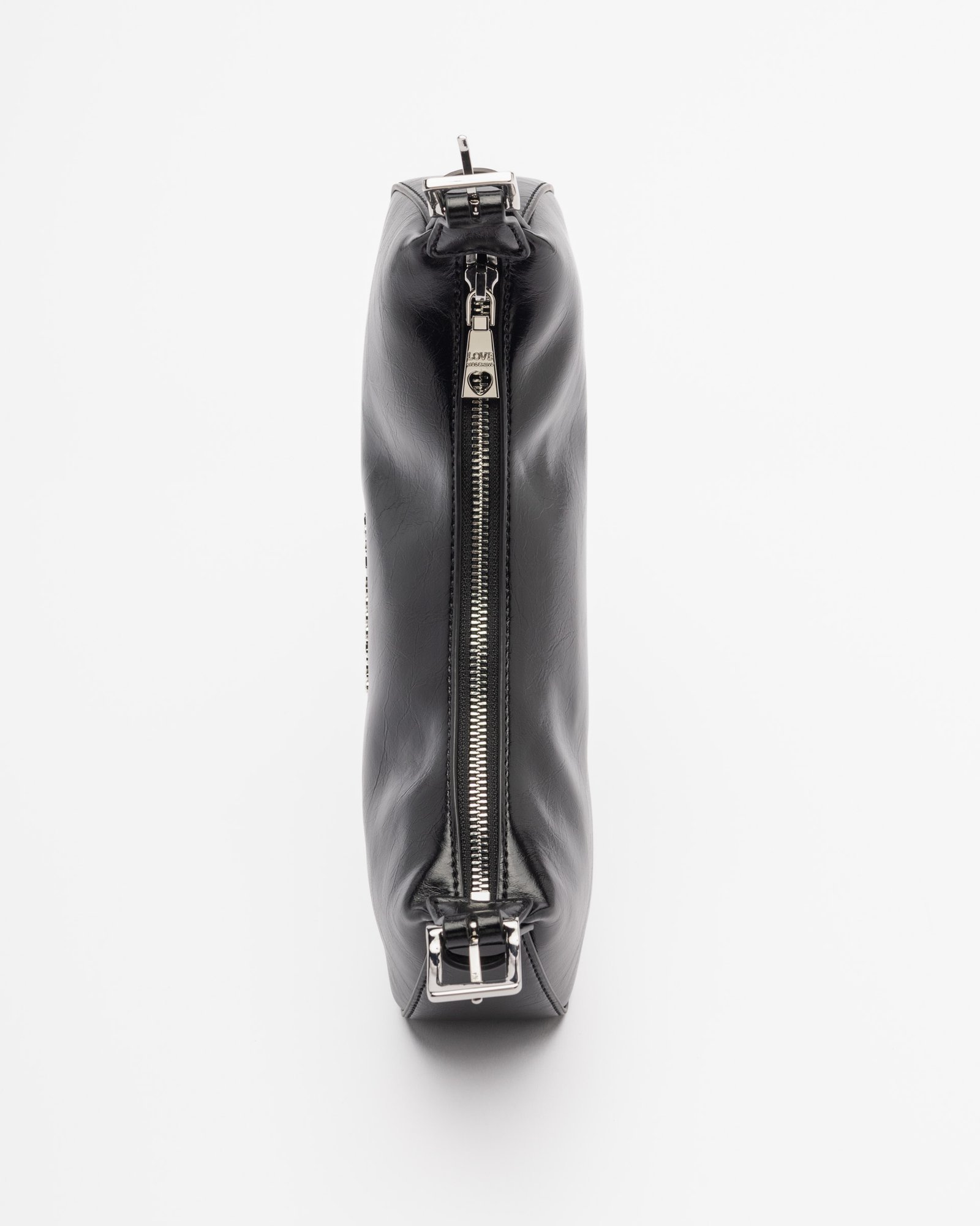 Black Love Moschino baguette-style handbag in smooth faux leather. Features silver Love Moschino lettering detail.