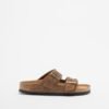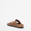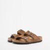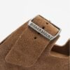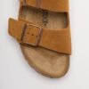 Camel Birkenstock sandal with a two-buckle design. Suede upper and anatomical cork-latex insole.