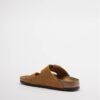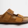 Camel sandal with two buckles in soft and malleable suede.