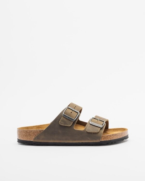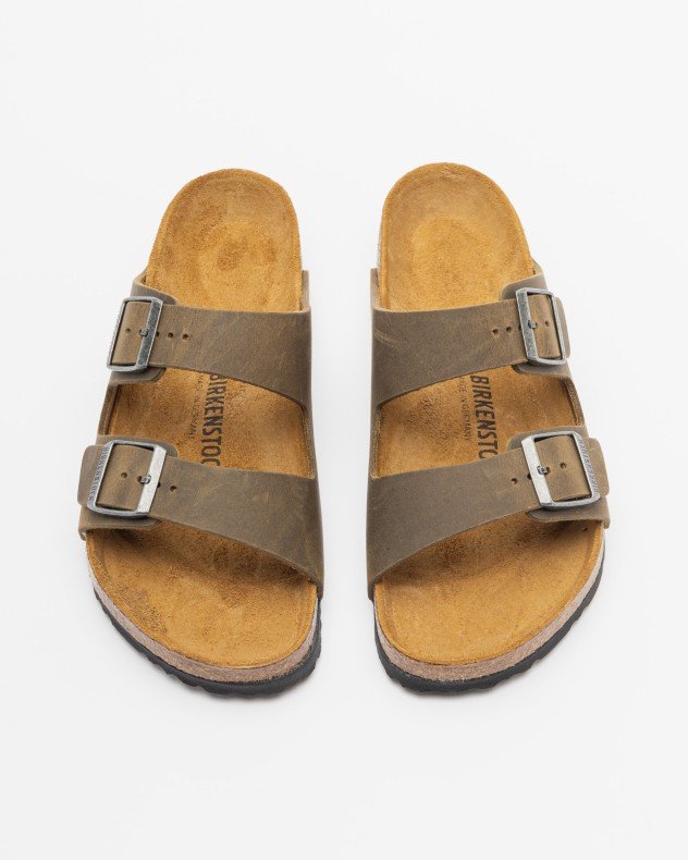 Birkenstock men’s sandal in green nubuck leather. Design with two buckles on the top and anatomical cork-latex insole.