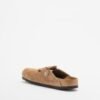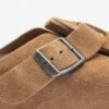 Birkenstock clogs for women, crafted from camel suede. Exclusive metal buckle and anatomical cork-latex insole.