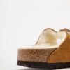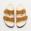 Birkenstock sandal in camel suede with two buckles. Beige fur lining and EVA sole.