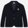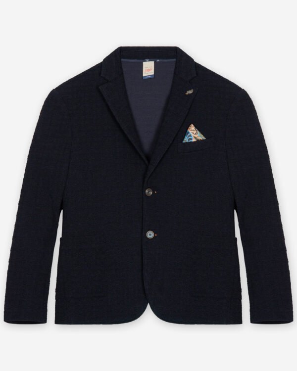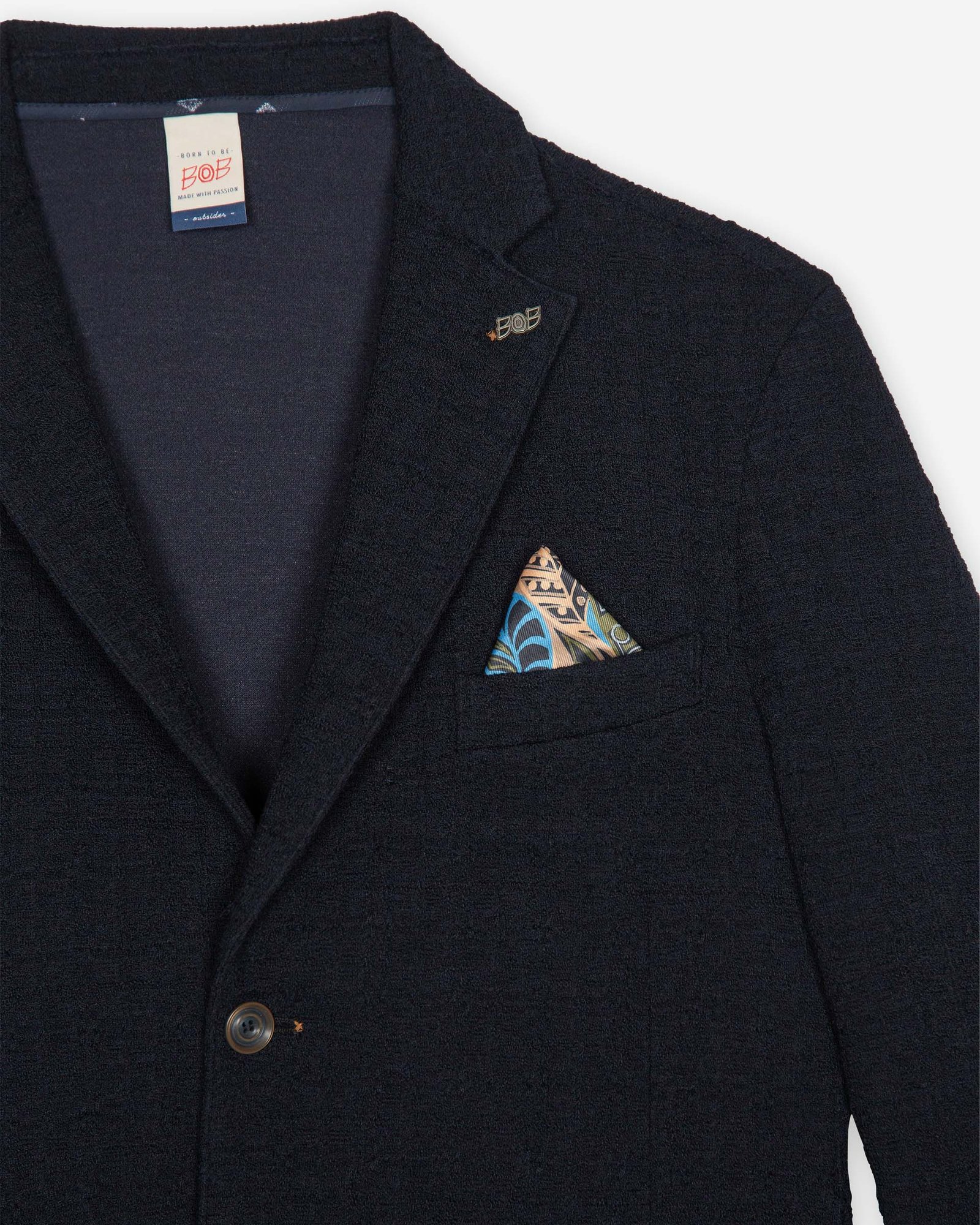 Men’s brown wool blend blazer. Designed with a decorative handkerchief on the chest pocket and a metallic BOB logo on the lapel.