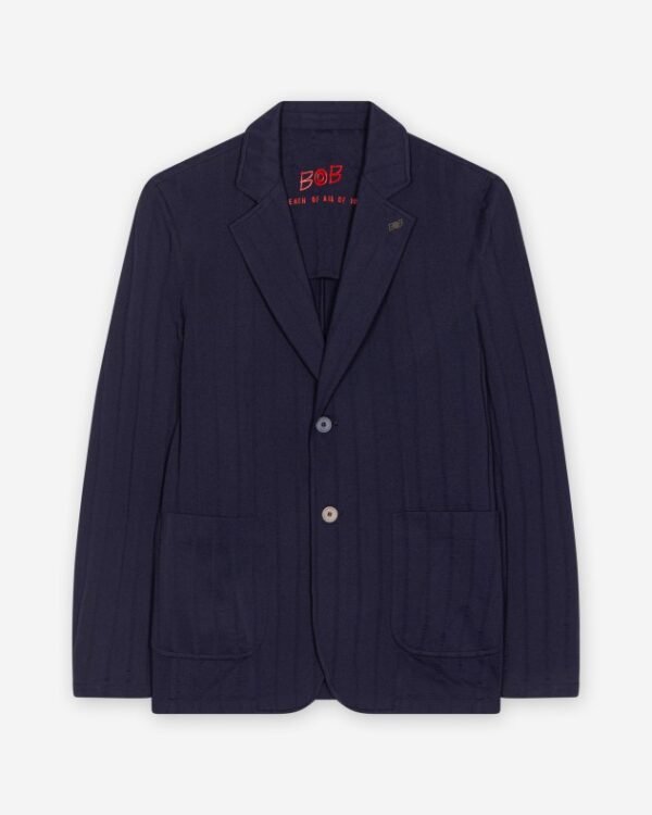Mens blue blazer with a vertical stripe pattern. Features front pockets, classic lapels and a two-button fastening at the front. Features a 3D BOB logo detail on the front.
