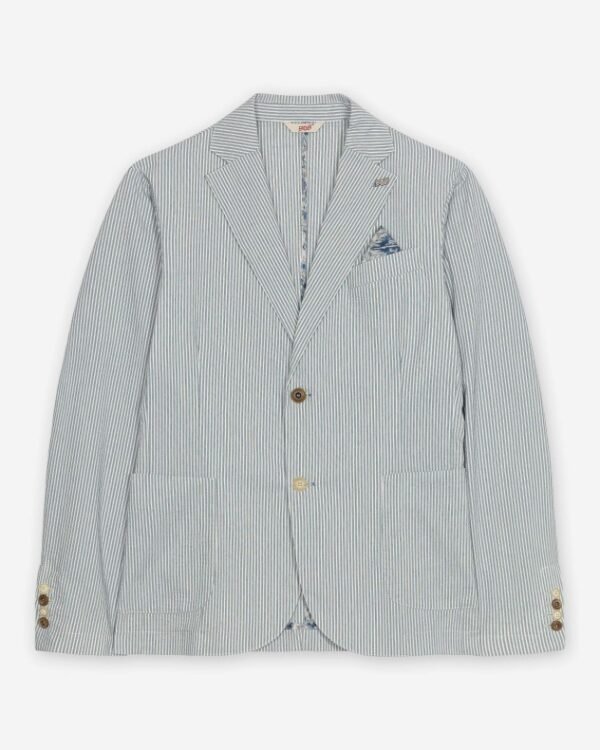 Green striped blazer for men with BOB metallic logo on the lapel. Contrasting lining with pocket square effect on the breast pocket.