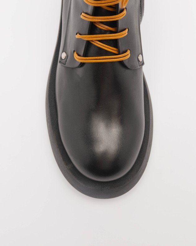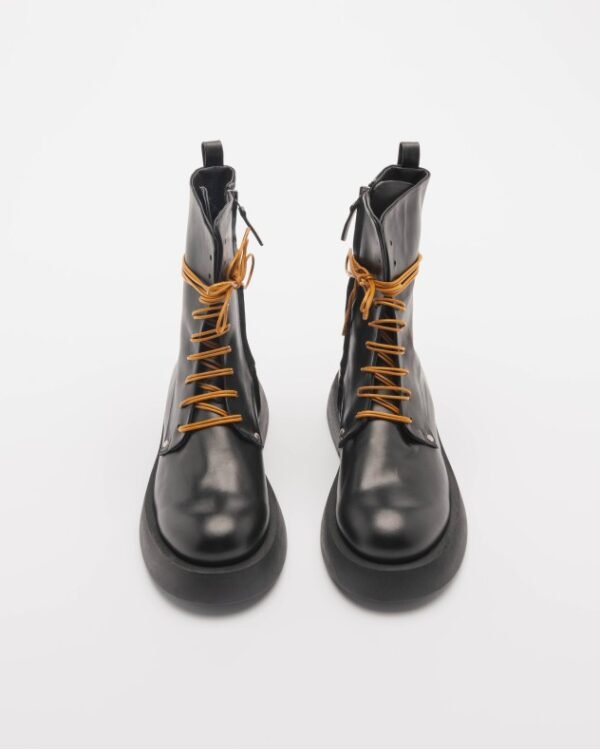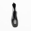 Black premium leather boots with a rounded toe and contrasting laces. Side zip.