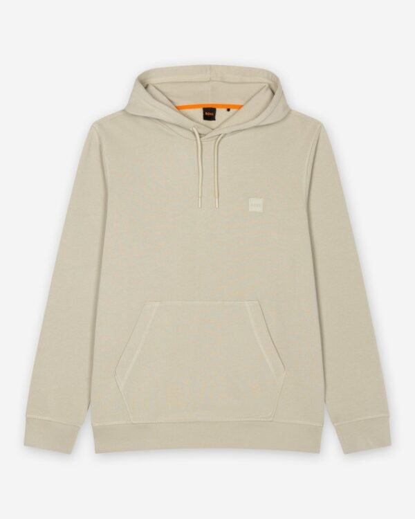 BOSS Menswear beige hoodie with logo patch on the chest, made from soft fabric.