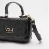 Black By Byblos handbag made of synthetic leather with an embossed monogram pattern. Features a handle and a metal By Byblos logo detail.
