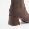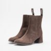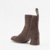 Brown mid-calf nubuck ankle boots with an asymmetrical toe. OrthoLite® Recycled™ footbed and rubber and ABS outsole.
