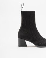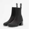 Women’s black mid-calf Camper boots with block heel, made of Lyocell TENCEL™ fabric. Features an adjustable strap at the back with embroidered Camper logo.