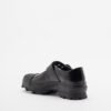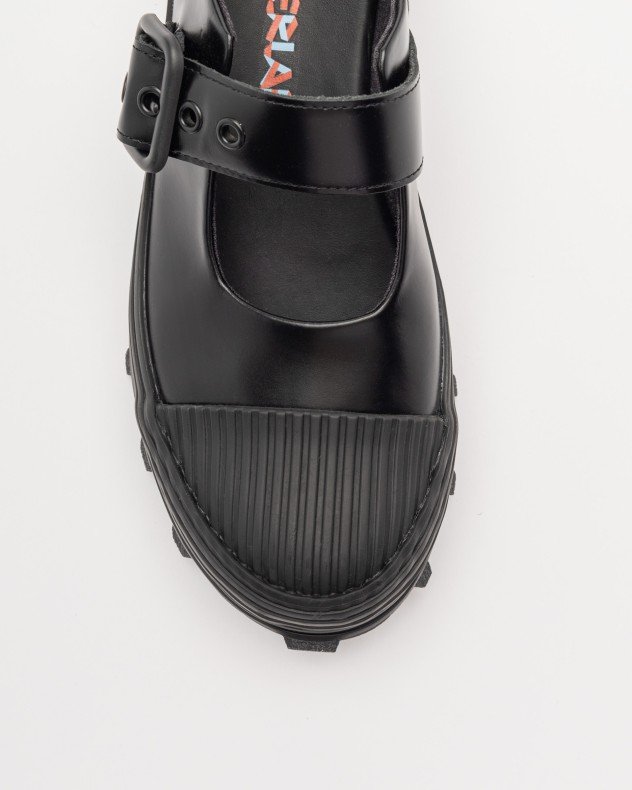 Black buckle shoe in vulcanized leather with a notched rubber outsole.