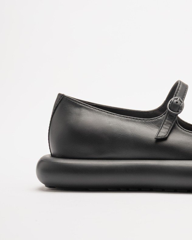 Black leather ballerinas with OrthoLite® Recycled™ footbed and XL EXTRALIGHT® EVA outsole. Instep strap with buckle.
