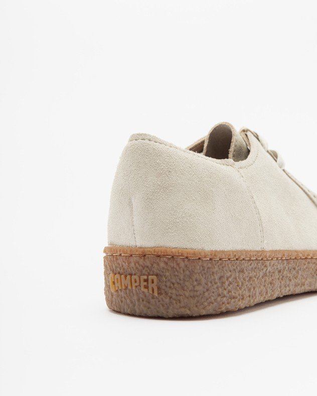 Camper shoes for men in beige suede. OrthoLite® Recycled insole and rugged rubber outsole.