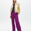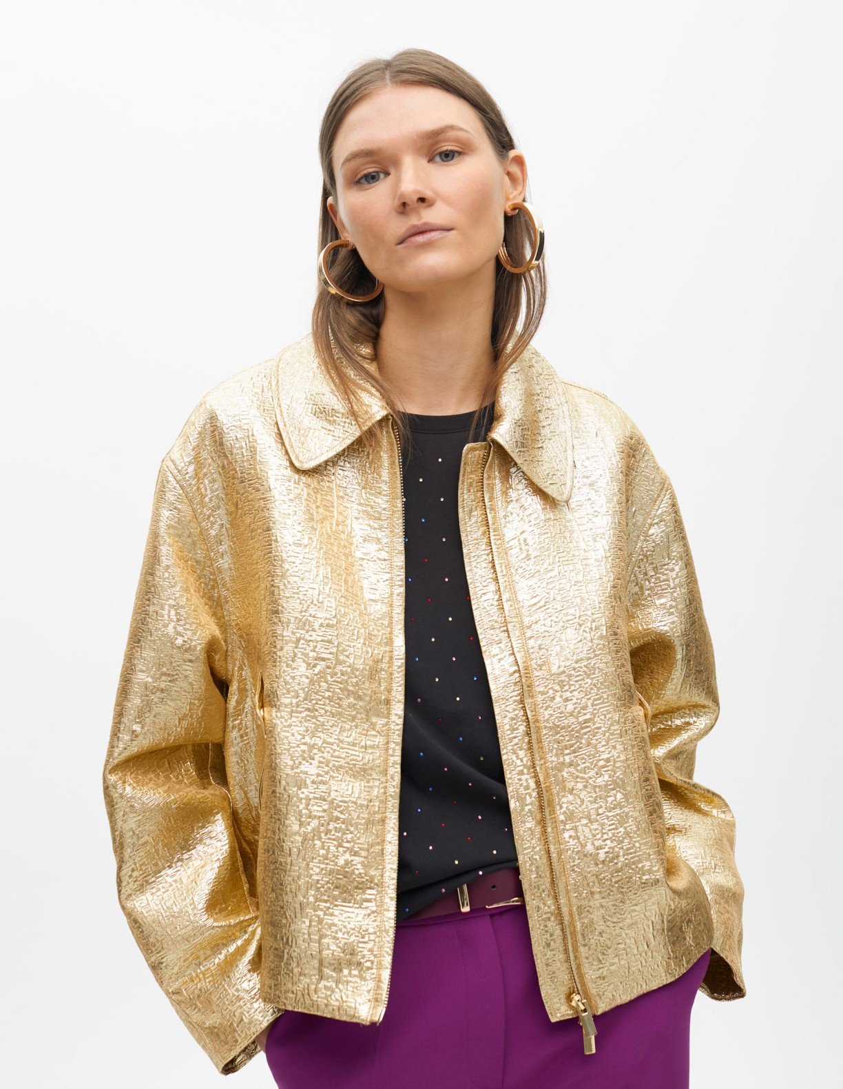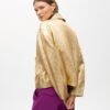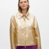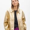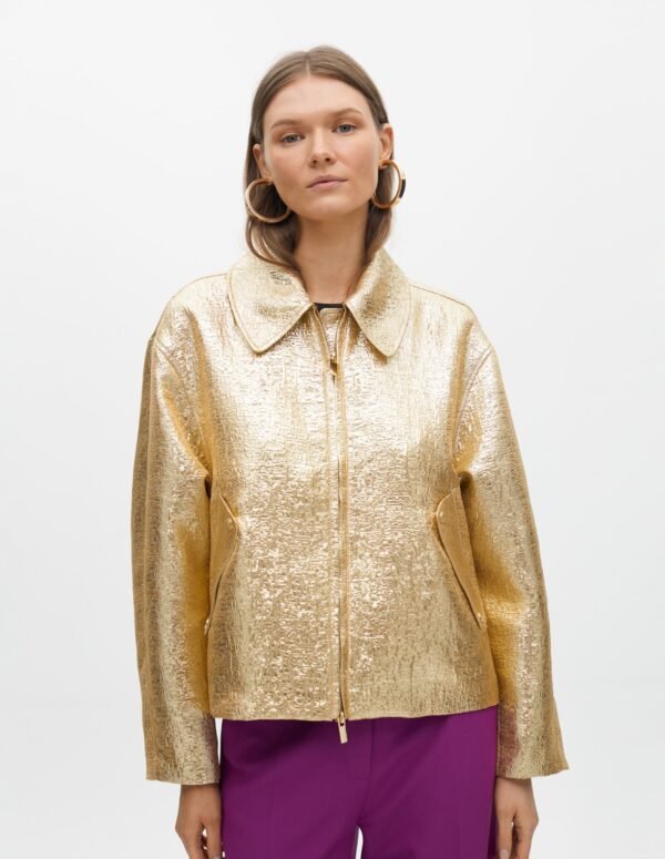 Gold bomber jacket with a shiny crackle finish. Classic collar design and front zipper closure.