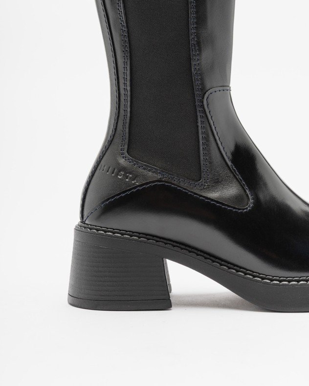 Polished black leather Chelsea boots with a square toe. Miista brand logo embossed on the side.