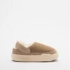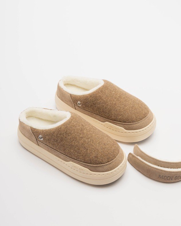 Taupe clogs in felt and suede. Padded design and removable heel strap with Moon Boot logo.