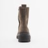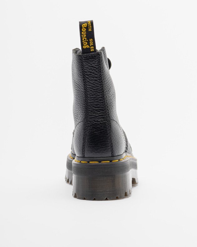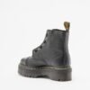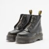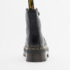 Black Dr. Martens boots in broken-effect leather. Front zipper, yellow stitching, and an AirWair strap on the heel.
