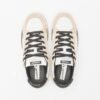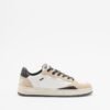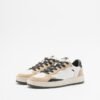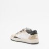 Women’s white sneakers with a perforated toe and beige suede overlays. Black sequin details and a gold Crime logo print on the heel.