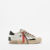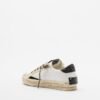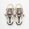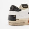 White leather sneakers with contrasting details and tiger laces. Sequined heel and Crime London logo on the side.