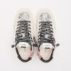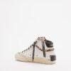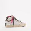 White Crime London high-top sneakers for women in genuine leather with suede details. Features an animal print fur stripe detail, silver glitter-covered tongue, and shocking pink branding detail on the side.