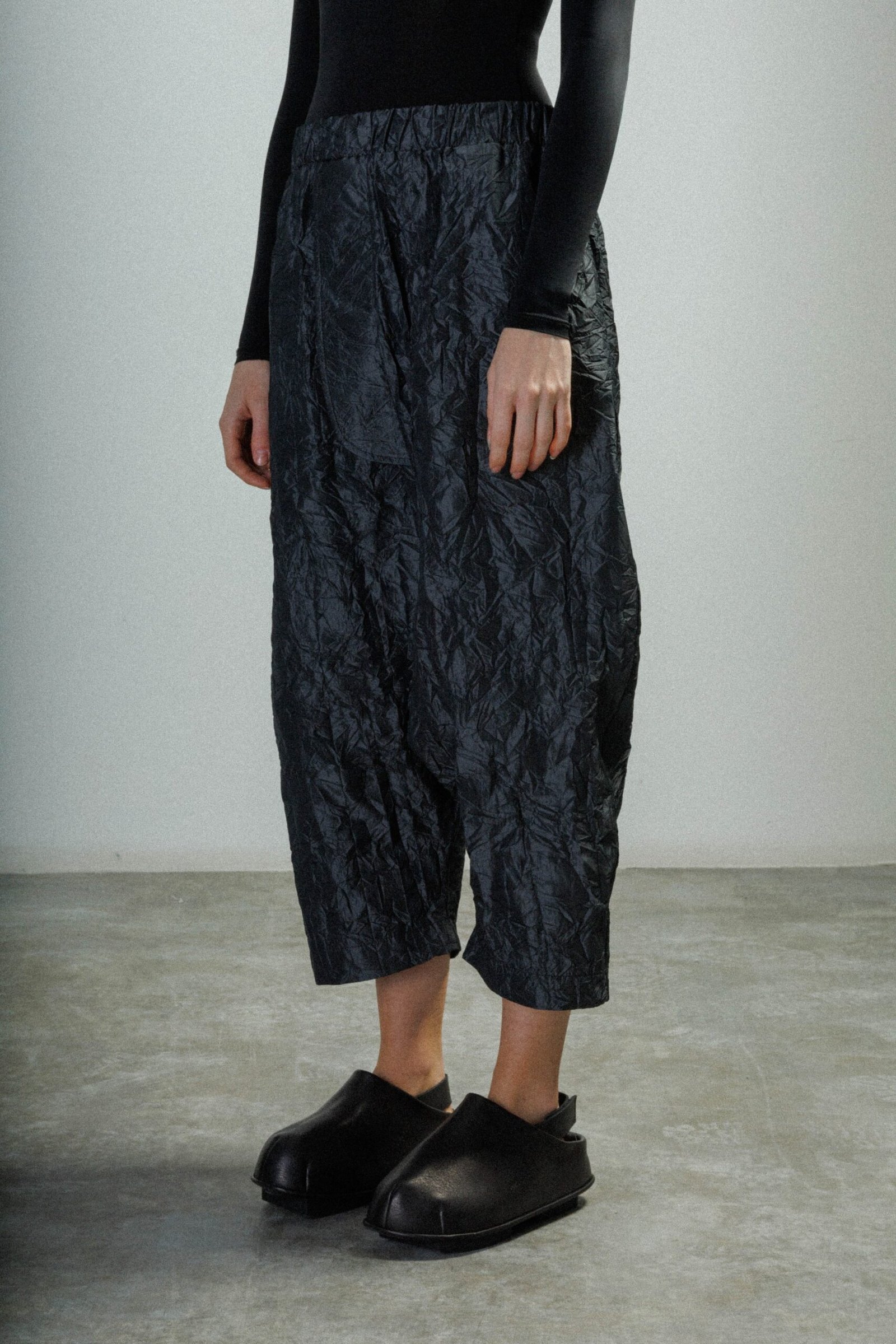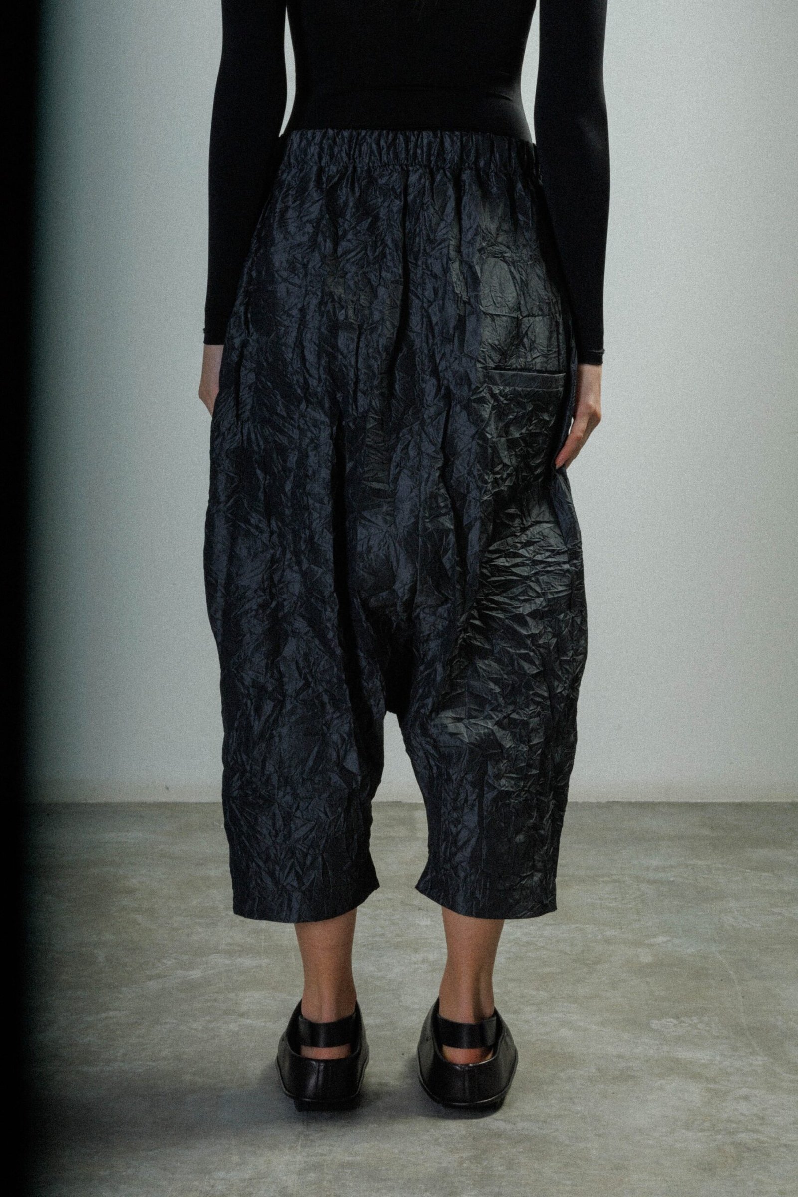 D-ROSS grey trousers with a crinkled effect. Elasticated waistband and side pockets.